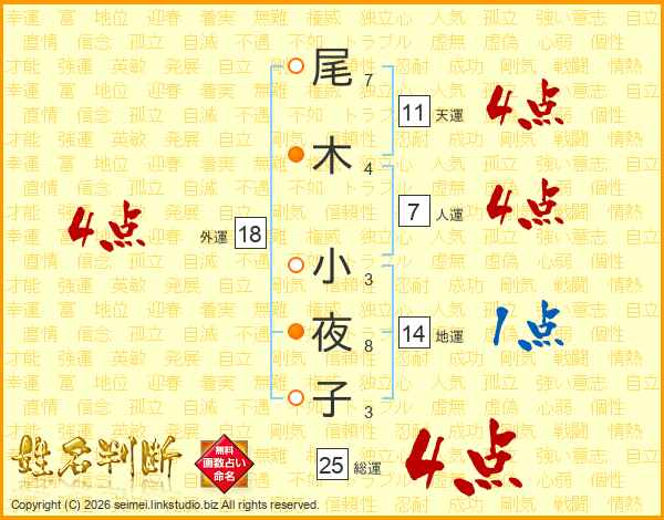 尾(7画)木(4画) 小(3画)夜(8画)子(3画)