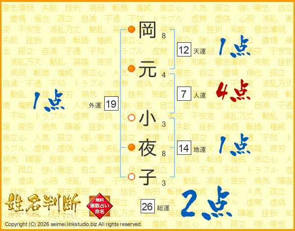 岡(8画)元(4画) 小(3画)夜(8画)子(3画)