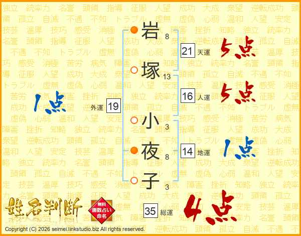 岩(8画)塚(13画) 小(3画)夜(8画)子(3画)