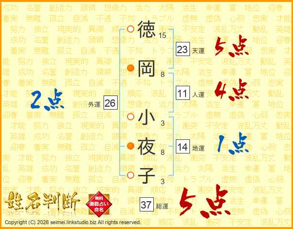 徳(15画)岡(8画) 小(3画)夜(8画)子(3画)