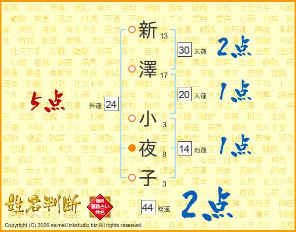 新(13画)澤(17画) 小(3画)夜(8画)子(3画)