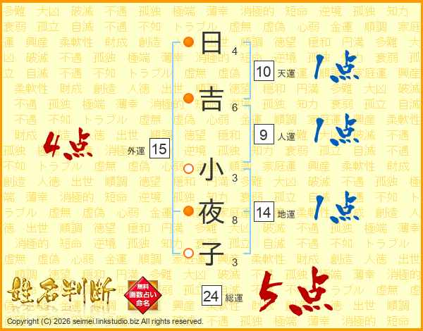 日(4画)吉(6画) 小(3画)夜(8画)子(3画)
