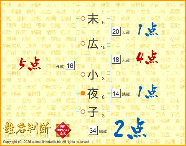 末(5画)広(15画) 小(3画)夜(8画)子(3画)