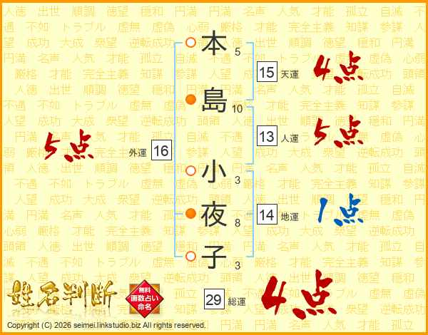 本島小夜子さんの総運は29画の4点!