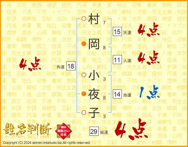 村(7画)岡(8画) 小(3画)夜(8画)子(3画)