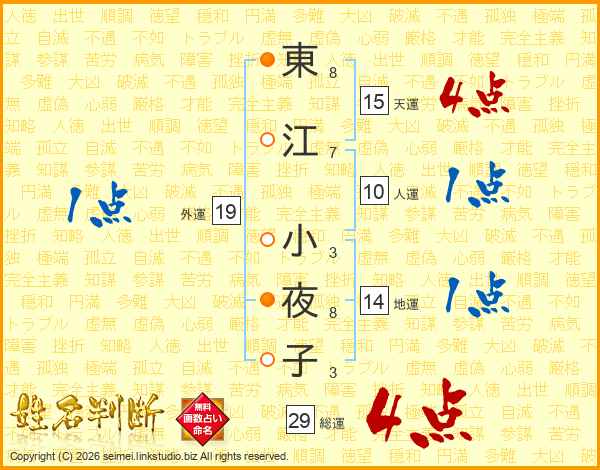 東(8画)江(7画) 小(3画)夜(8画)子(3画)