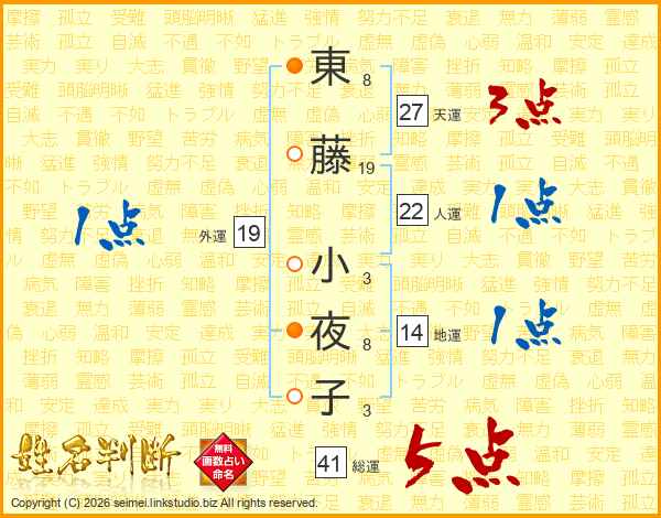 東(8画)藤(19画) 小(3画)夜(8画)子(3画)