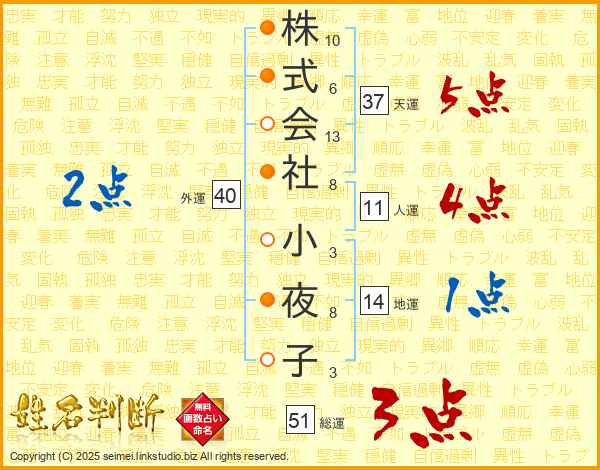 株(10画)式(6画)会(13画)社(8画) 小(3画)夜(8画)子(3画)