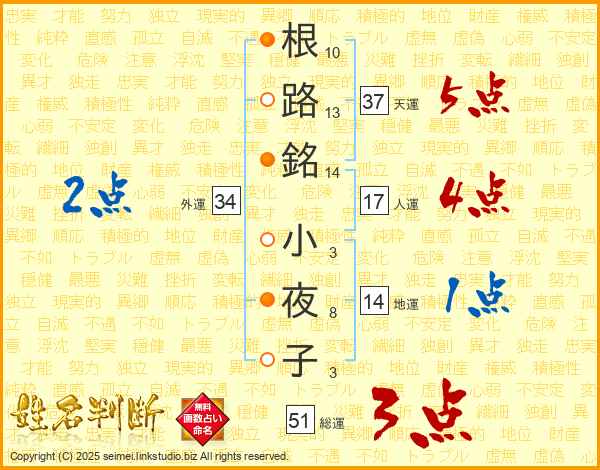 根(10画)路(13画)銘(14画) 小(3画)夜(8画)子(3画)