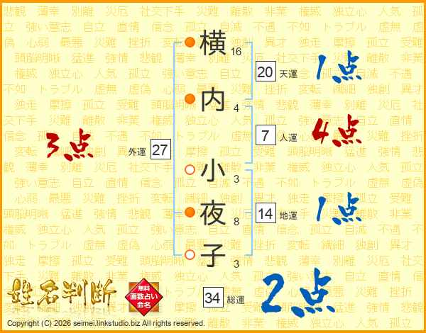 横(16画)内(4画) 小(3画)夜(8画)子(3画)
