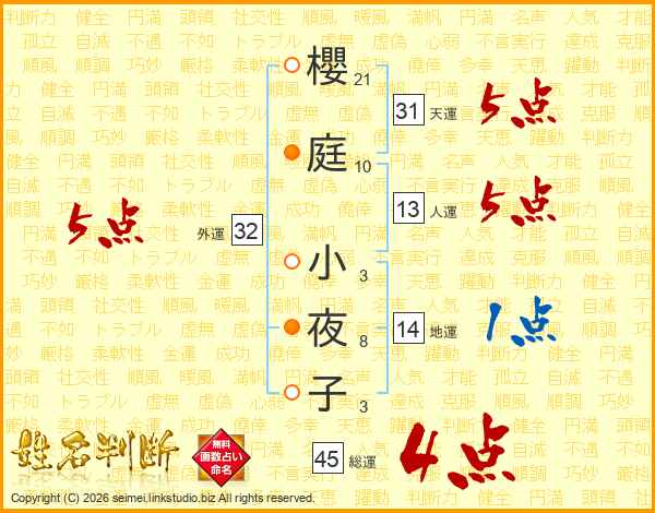 櫻(21画)庭(10画) 小(3画)夜(8画)子(3画)