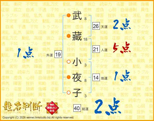 武(8画)藏(18画) 小(3画)夜(8画)子(3画)