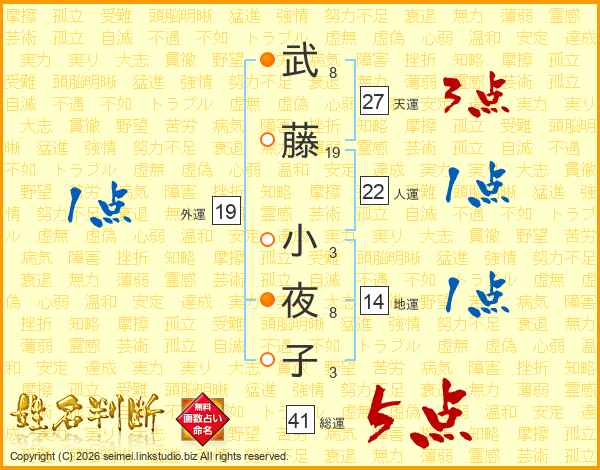 武(8画)藤(19画)  小(3画)夜(8画)子(3画)