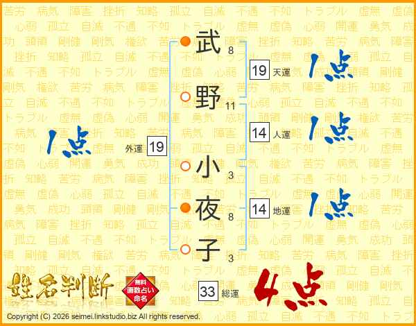 武(8画)野(11画) 小(3画)夜(8画)子(3画)