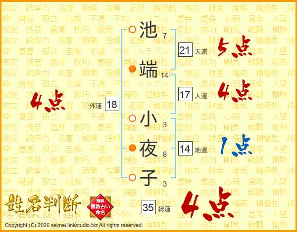 池(7画)端(14画)  小(3画)夜(8画)子(3画)
