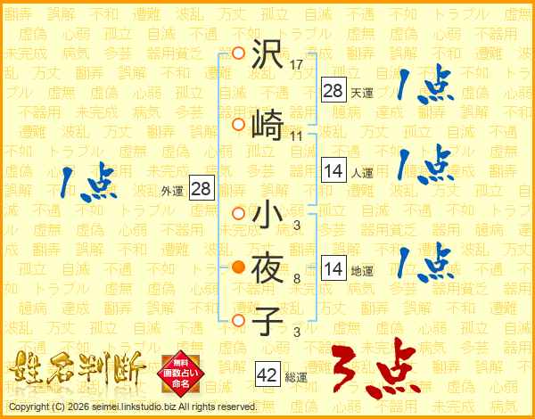 沢(17画)崎(11画) 小(3画)夜(8画)子(3画)
