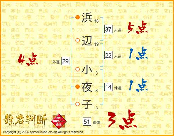 浜(18画)辺(19画) 小(3画)夜(8画)子(3画)