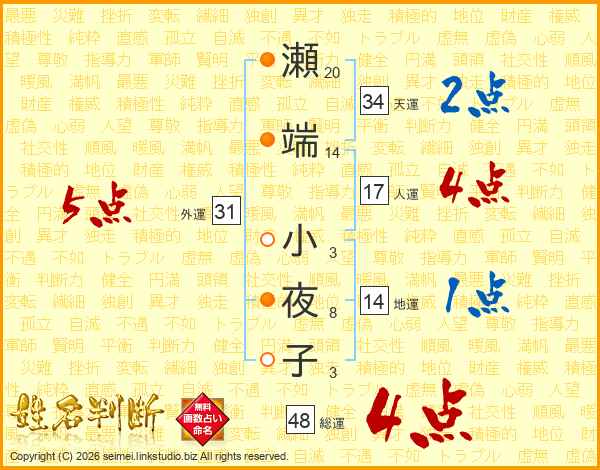 瀬端小夜子さんの総運は48画の4点!