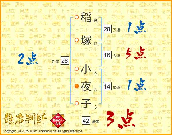 稲(15画)塚(13画) 小(3画)夜(8画)子(3画)
