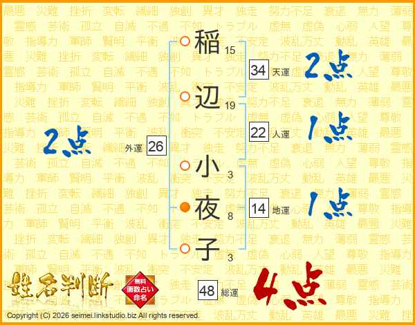 稲(15画)辺(19画) 小(3画)夜(8画)子(3画)