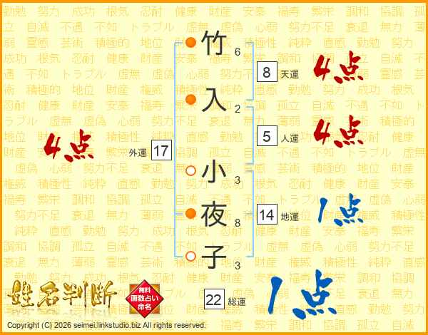 生活面を象徴する運勢です。外部から受ける影響力を表し、結婚運、家庭運や職場、環境への順応性を表します。総運から人運を引いた画数。姓や名が1文字の場合を除く。