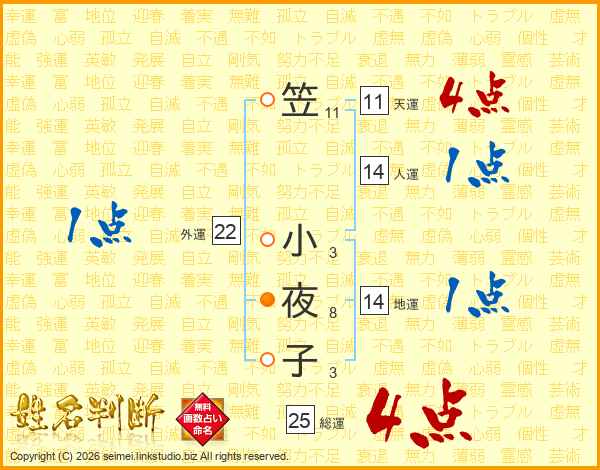 生活面を象徴する運勢です。外部から受ける影響力を表し、結婚運、家庭運や職場、環境への順応性を表します。総運から人運を引いた画数。姓や名が1文字の場合を除く。
