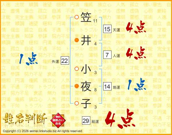 笠(11画)井(4画) 小(3画)夜(8画)子(3画)