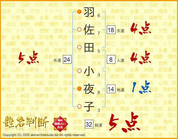 羽(6画)佐(7画)田(5画) 小(3画)夜(8画)子(3画)