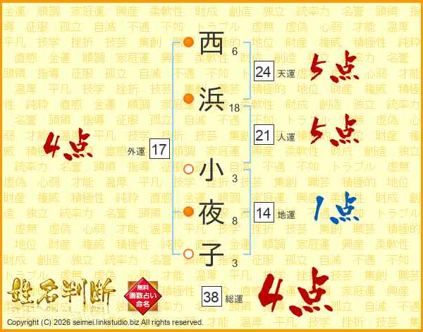 西(6画)浜(18画) 小(3画)夜(8画)子(3画)
