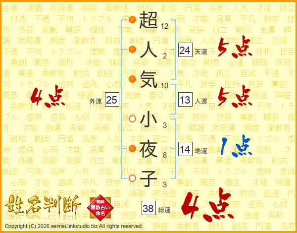 超人気小夜子さんの総運は38画の4点!