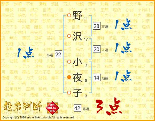 野(11画)沢(17画) 小(3画)夜(8画)子(3画)