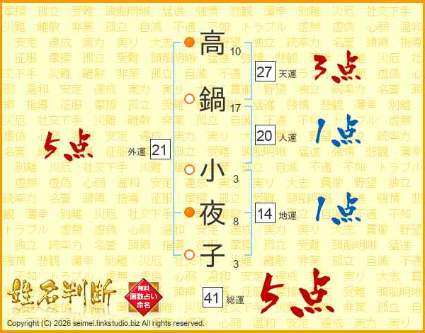 高(10画)鍋(17画) 小(3画)夜(8画)子(3画)