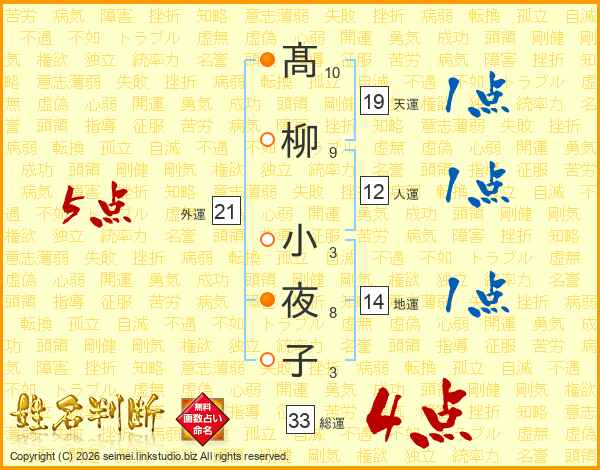 髙(10画)柳(9画) 小(3画)夜(8画)子(3画)