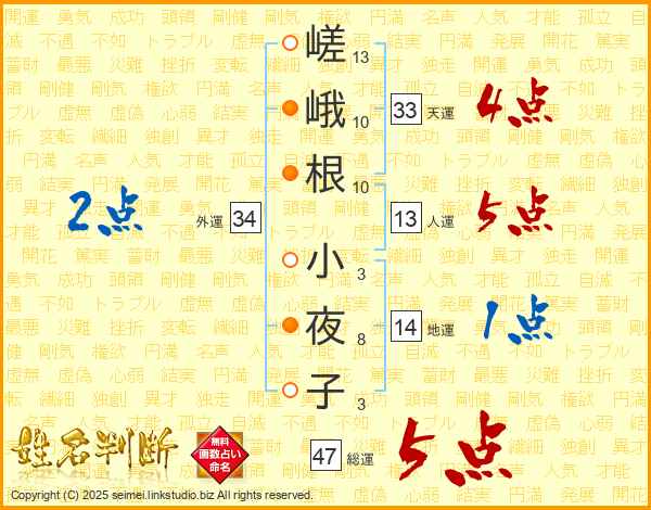 嵯(13画)峨(10画)根(10画) 小(3画)夜(8画)子(3画)