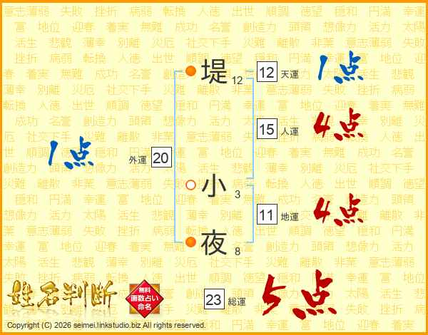 生活面を象徴する運勢です。外部から受ける影響力を表し、結婚運、家庭運や職場、環境への順応性を表します。総運から人運を引いた画数。姓や名が1文字の場合を除く。