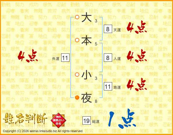 あなたの人生を表す1番重要な運勢です。生涯を通じて影響する総合運となり、主に50歳以降の晩年期に影響を及ぼします。苗字と名前の合計画数。