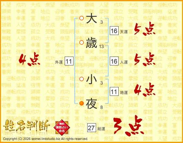大(3画)歳(13画) 小(3画)夜(8画)