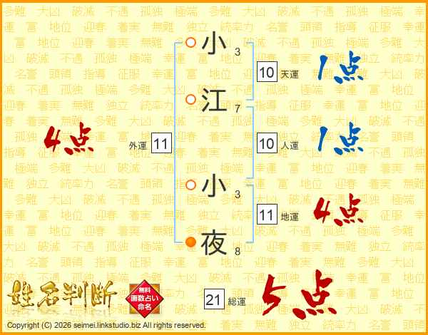画数の奇数(○陽)と偶数(●陰)の配列で吉凶を占います。どちらかにかたよる名前は大凶名で避ける必要があります。画数の奇数偶数。