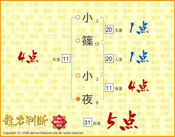 生活面を象徴する運勢です。外部から受ける影響力を表し、結婚運、家庭運や職場、環境への順応性を表します。総運から人運を引いた画数。姓や名が1文字の場合を除く。