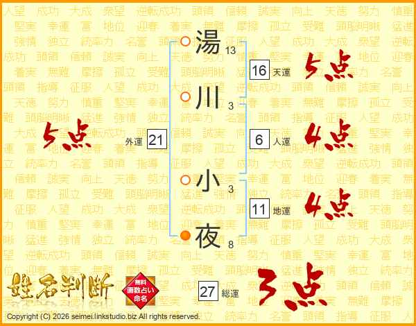 生活面を象徴する運勢です。外部から受ける影響力を表し、結婚運、家庭運や職場、環境への順応性を表します。総運から人運を引いた画数。姓や名が1文字の場合を除く。
