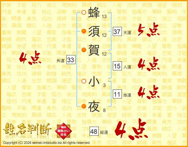 蜂(13画)須(12画)賀(12画) 小(3画)夜(8画)