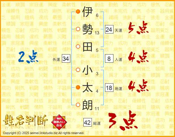 伊(6画)勢(13画)田(5画) 小(3画)太(4画)朗(11画)