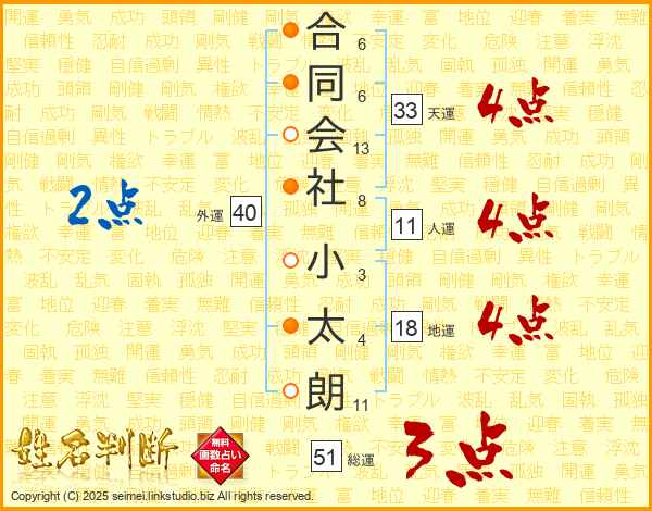 合(6画)同(6画)会(13画)社(8画) 小(3画)太(4画)朗(11画)