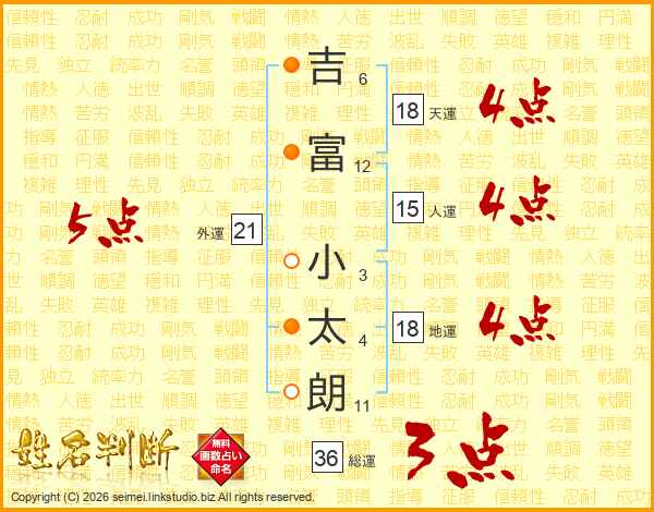 吉(6画)富(12画) 小(3画)太(4画)朗(11画)