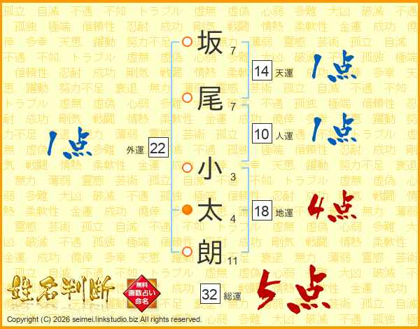 坂(7画)尾(7画) 小(3画)太(4画)朗(11画)