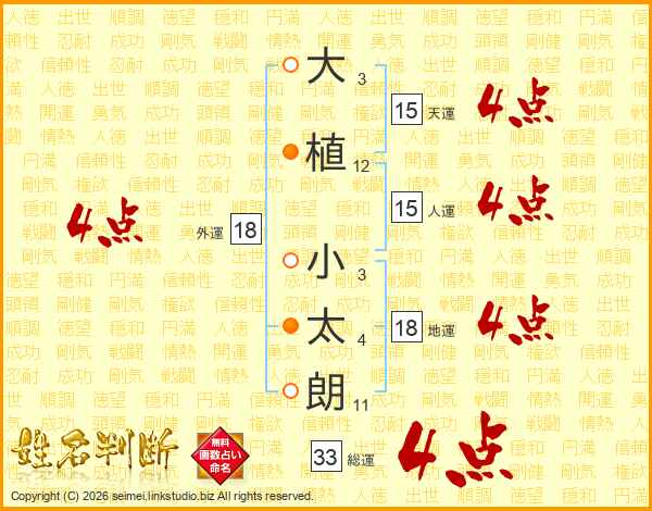 大(3画)植(12画) 小(3画)太(4画)朗(11画)