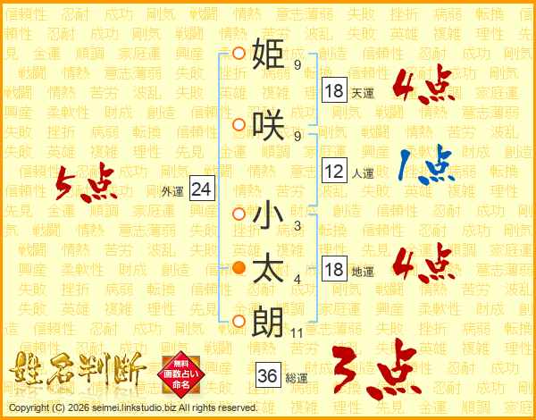 姫(9画)咲(9画) 小(3画)太(4画)朗(11画)