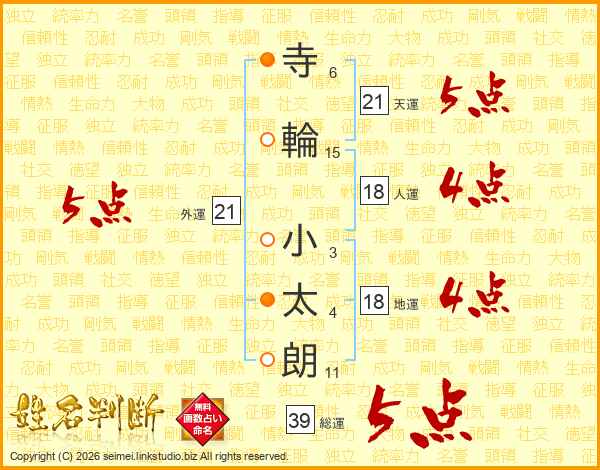 寺(6画)輪(15画) 小(3画)太(4画)朗(11画)