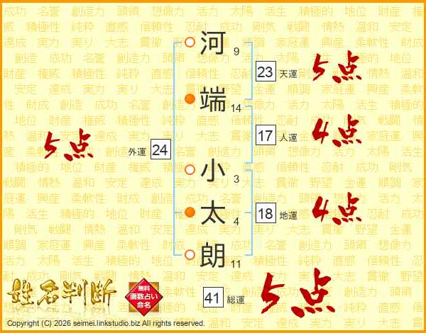 河(9画)端(14画) 小(3画)太(4画)朗(11画)