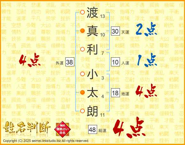 渡(13画)真(10画)利(7画) 小(3画)太(4画)朗(11画)